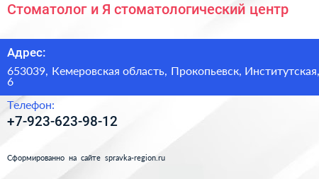 Стоматолог и Я, стоматологический центр по адресу 653039, Кемеровская область, Прокопьевск, Институтская, 6 в дальнейшем Организация, размещена в следующих категориях: