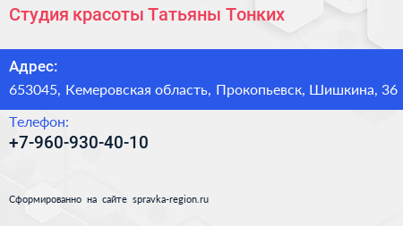 Студия красоты Татьяны Тонких по адресу 653045, Кемеровская область, Прокопьевск, Шишкина, 36 в дальнейшем Организация, размещена в следующих категориях: