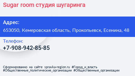 Sugar room, студия шугаринга по адресу 653050, Кемеровская область, Прокопьевск, Есенина, 48 в дальнейшем Организация, размещена в следующих категориях: