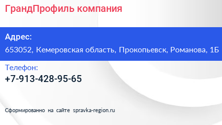 ГрандПрофиль, компания по адресу 653052, Кемеровская область, Прокопьевск, Романова, 1Б в дальнейшем Организация, размещена в следующих категориях:
