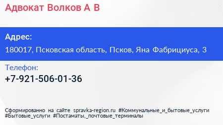Адвокат Волков А.В. по адресу 180017, Псковская область, Псков, Яна Фабрициуса, 3 в дальнейшем Организация, размещена в следующих категориях: