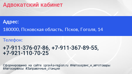 Адвокатский кабинет по адресу 180000, Псковская область, Псков, Гоголя, 14 в дальнейшем Организация, размещена в следующих категориях: