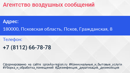 Агентство воздушных сообщений по адресу 180000, Псковская область, Псков, Гражданская, 8 в дальнейшем Организация, размещена в следующих категориях:
