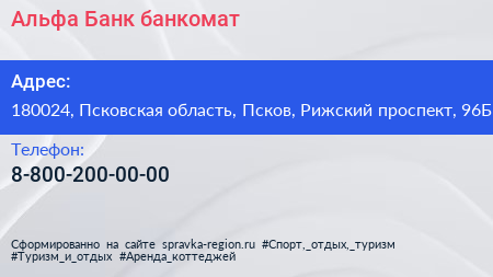 Альфа-Банк, банкомат по адресу 180024, Псковская область, Псков, Рижский проспект, 96Б в дальнейшем Организация, размещена в следующих категориях: