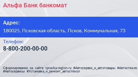 Альфа-Банк, банкомат по адресу 180025, Псковская область, Псков, Коммунальная, 73 в дальнейшем Организация, размещена в следующих категориях: