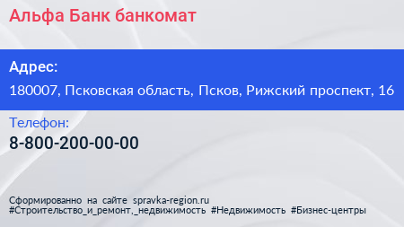 Альфа-Банк, банкомат по адресу 180007, Псковская область, Псков, Рижский проспект, 16 в дальнейшем Организация, размещена в следующих категориях:
