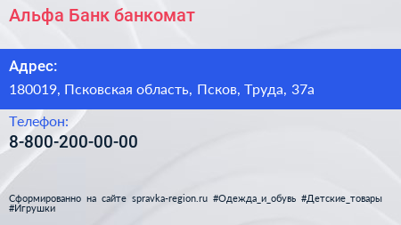 Альфа-Банк, банкомат по адресу 180019, Псковская область, Псков, Труда, 37а в дальнейшем Организация, размещена в следующих категориях: