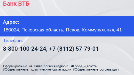 Банк ВТБ по адресу 180024, Псковская область, Псков, Коммунальная, 41 в дальнейшем Организация, размещена в следующих категориях: