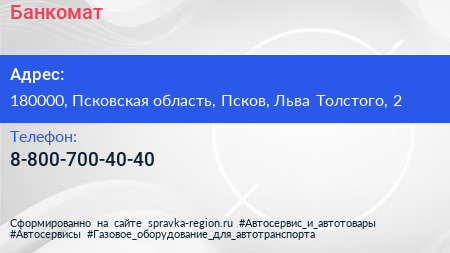 Банкомат по адресу 180000, Псковская область, Псков, Льва Толстого, 2 в дальнейшем Организация, размещена в следующих категориях: