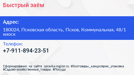 Быстрый заём по адресу 180024, Псковская область, Псков, Коммунальная, 48/1 киоск в дальнейшем Организация, размещена в следующих категориях: