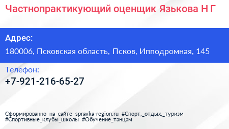Частнопрактикующий оценщик Язькова Н.Г. по адресу 180006, Псковская область, Псков, Ипподромная, 145 в дальнейшем Организация, размещена в следующих категориях: