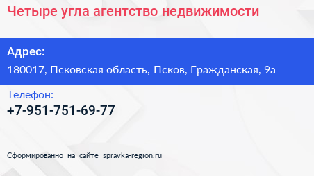 Четыре угла, агентство недвижимости по адресу 180017, Псковская область, Псков, Гражданская, 9а в дальнейшем Организация, размещена в следующих категориях:
