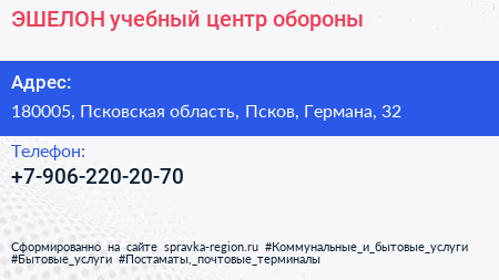 ЭШЕЛОН, учебный центр обороны по адресу 180005, Псковская область, Псков, Германа, 32 в дальнейшем Организация, размещена в следующих категориях: