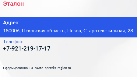 Эталон по адресу 180006, Псковская область, Псков, Старотекстильная, 28 в дальнейшем Организация, размещена в следующих категориях: