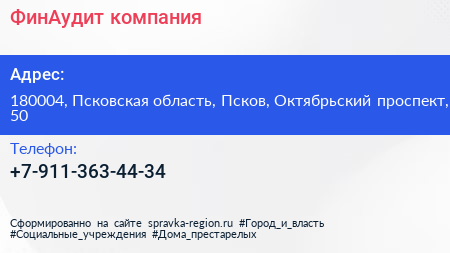 ФинАудит, компания по адресу 180004, Псковская область, Псков, Октябрьский проспект, 50 в дальнейшем Организация, размещена в следующих категориях:
