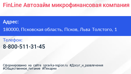 FinLine-Автозайм, микрофинансовая компания по адресу 180000, Псковская область, Псков, Льва Толстого, 1 в дальнейшем Организация, размещена в следующих категориях: