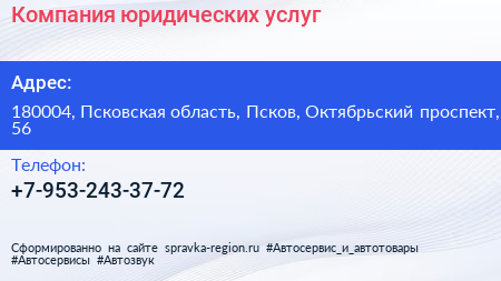 Компания юридических услуг по адресу 180004, Псковская область, Псков, Октябрьский проспект, 56 в дальнейшем Организация, размещена в следующих категориях: