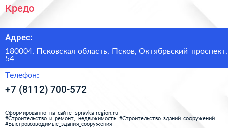 Кредо по адресу 180004, Псковская область, Псков, Октябрьский проспект, 54 в дальнейшем Организация, размещена в следующих категориях: