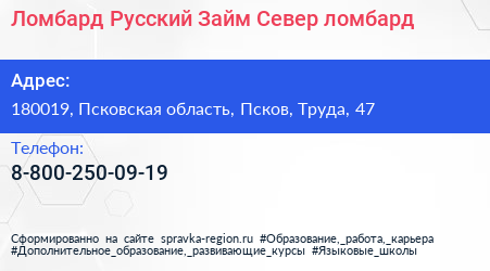 Ломбард Русский Займ Север, ломбард по адресу 180019, Псковская область, Псков, Труда, 47 в дальнейшем Организация, размещена в следующих категориях: