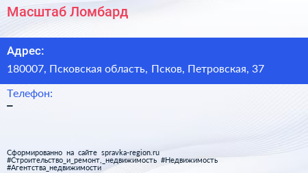 Масштаб Ломбард по адресу 180007, Псковская область, Псков, Петровская, 37 в дальнейшем Организация, размещена в следующих категориях: