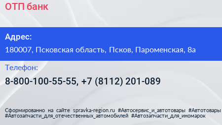 ОТП банк по адресу 180007, Псковская область, Псков, Пароменская, 8а в дальнейшем Организация, размещена в следующих категориях: