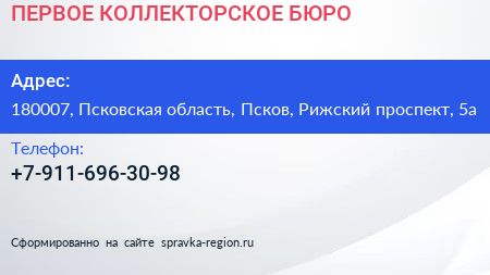 ПЕРВОЕ КОЛЛЕКТОРСКОЕ БЮРО по адресу 180007, Псковская область, Псков, Рижский проспект, 5а в дальнейшем Организация, размещена в следующих категориях: