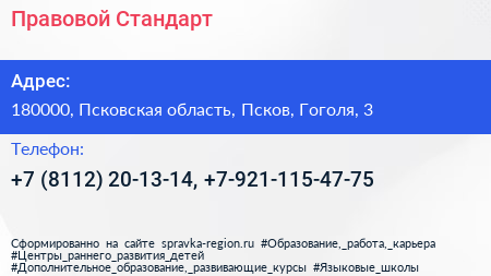 Правовой Стандарт по адресу 180000, Псковская область, Псков, Гоголя, 3 в дальнейшем Организация, размещена в следующих категориях: