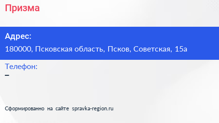 Призма по адресу 180000, Псковская область, Псков, Советская, 15а в дальнейшем Организация, размещена в следующих категориях: