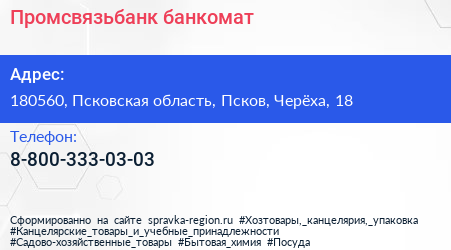 Промсвязьбанк, банкомат по адресу 180560, Псковская область, Псков, Черёха, 18 в дальнейшем Организация, размещена в следующих категориях: