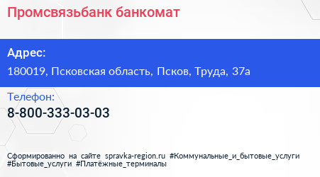 Промсвязьбанк, банкомат по адресу 180019, Псковская область, Псков, Труда, 37а в дальнейшем Организация, размещена в следующих категориях: