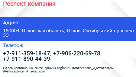 Респект, компания по адресу 180004, Псковская область, Псков, Октябрьский проспект, 50 в дальнейшем Организация, размещена в следующих категориях: