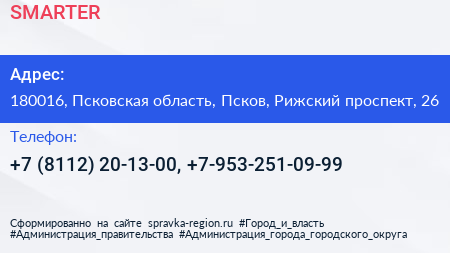 SMARTER по адресу 180016, Псковская область, Псков, Рижский проспект, 26 в дальнейшем Организация, размещена в следующих категориях: