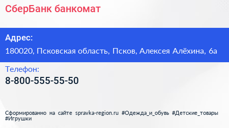 СберБанк, банкомат по адресу 180020, Псковская область, Псков, Алексея Алёхина, 6а в дальнейшем Организация, размещена в следующих категориях: