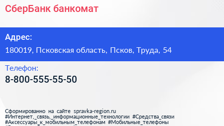 СберБанк, банкомат по адресу 180019, Псковская область, Псков, Труда, 54 в дальнейшем Организация, размещена в следующих категориях: