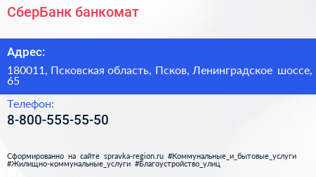 СберБанк, банкомат по адресу 180011, Псковская область, Псков, Ленинградское шоссе, 65 в дальнейшем Организация, размещена в следующих категориях: