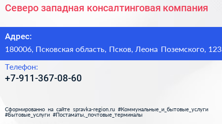 Северо-западная консалтинговая компания по адресу 180006, Псковская область, Псков, Леона Поземского, 123а в дальнейшем Организация, размещена в следующих категориях: