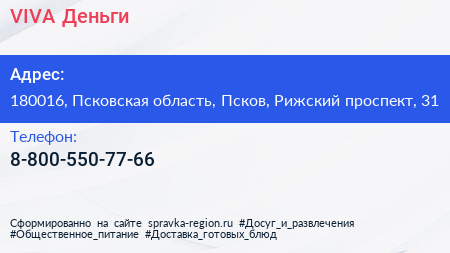 VIVA Деньги по адресу 180016, Псковская область, Псков, Рижский проспект, 31 в дальнейшем Организация, размещена в следующих категориях: