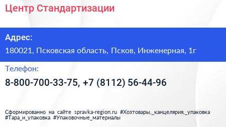 Центр Стандартизации по адресу 180021, Псковская область, Псков, Инженерная, 1г в дальнейшем Организация, размещена в следующих категориях: