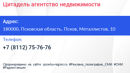 Цитадель, агентство недвижимости по адресу 180000, Псковская область, Псков, Металлистов, 10 в дальнейшем Организация, размещена в следующих категориях: