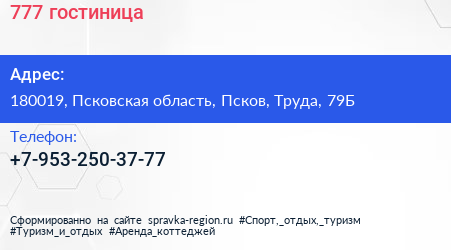 777, гостиница по адресу 180019, Псковская область, Псков, Труда, 79Б в дальнейшем Организация, размещена в следующих категориях: