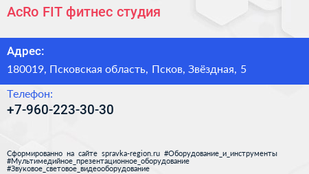 AcRo FIT, фитнес-студия по адресу 180019, Псковская область, Псков, Звёздная, 5 в дальнейшем Организация, размещена в следующих категориях: