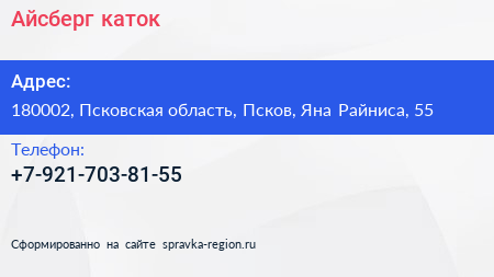 Айсберг, каток по адресу 180002, Псковская область, Псков, Яна Райниса, 55 в дальнейшем Организация, размещена в следующих категориях: