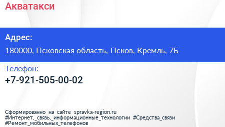 Акватакси по адресу 180000, Псковская область, Псков, Кремль, 7Б в дальнейшем Организация, размещена в следующих категориях: