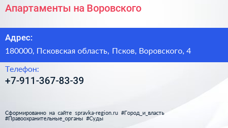 Апартаменты на Воровского по адресу 180000, Псковская область, Псков, Воровского, 4 в дальнейшем Организация, размещена в следующих категориях: