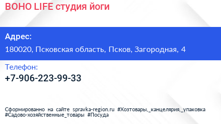 BOHO LIFE, студия йоги по адресу 180020, Псковская область, Псков, Загородная, 4 в дальнейшем Организация, размещена в следующих категориях: