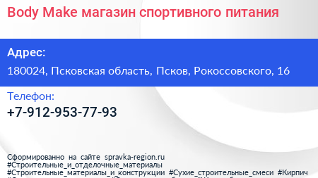 Body Make, магазин спортивного питания по адресу 180024, Псковская область, Псков, Рокоссовского, 16 в дальнейшем Организация, размещена в следующих категориях: