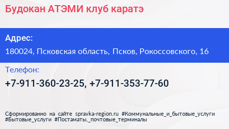 Будокан АТЭМИ, клуб каратэ по адресу 180024, Псковская область, Псков, Рокоссовского, 16 в дальнейшем Организация, размещена в следующих категориях: