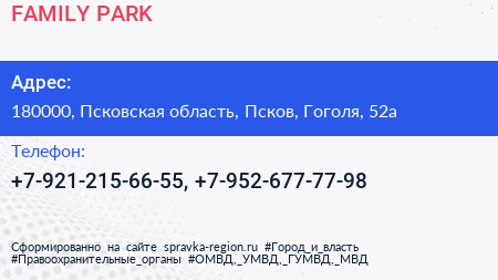 FAMILY PARK по адресу 180000, Псковская область, Псков, Гоголя, 52а в дальнейшем Организация, размещена в следующих категориях: