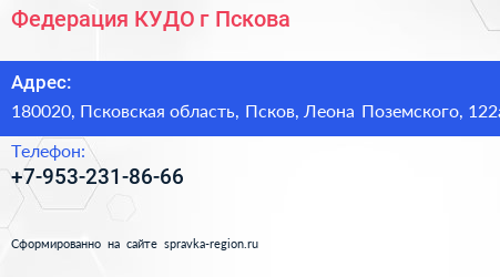 Федерация КУДО г. Пскова по адресу 180020, Псковская область, Псков, Леона Поземского, 122а в дальнейшем Организация, размещена в следующих категориях: