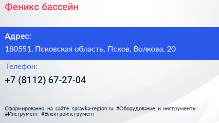 Феникс, бассейн по адресу 180551, Псковская область, Псков, Волкова, 20 в дальнейшем Организация, размещена в следующих категориях: